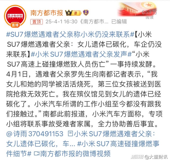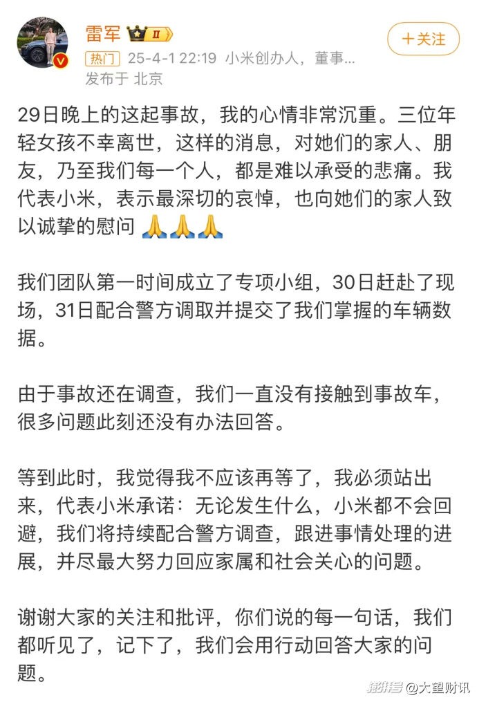 速度第一:错失先机,舆论被动 在危机公关的赛道上,速度就是生命线,分秒必争。然而,此次事件中,3 月 29 日晚事故不幸发生,可雷军直至 4 月 1 日晚才发声回应,遗憾地错过了危机公关最为关键的黄金 24 小时。在当下这个信息传播如闪电般迅速、呈裂变之势的时代,这一延迟,无疑如同打开了潘多拉魔盒,使得舆论如脱缰的野马,肆意奔腾、发酵。公众在长时间的等待中,始终未能获得官方的权威信息,不满与质疑的情绪如同不断充气的气球,越积越多,最终使得小米在舆论场的初期阶段,陷入了极为被动的困境。小米此次在速度上的滞后,无疑给自身应对危机增添了重重难度。