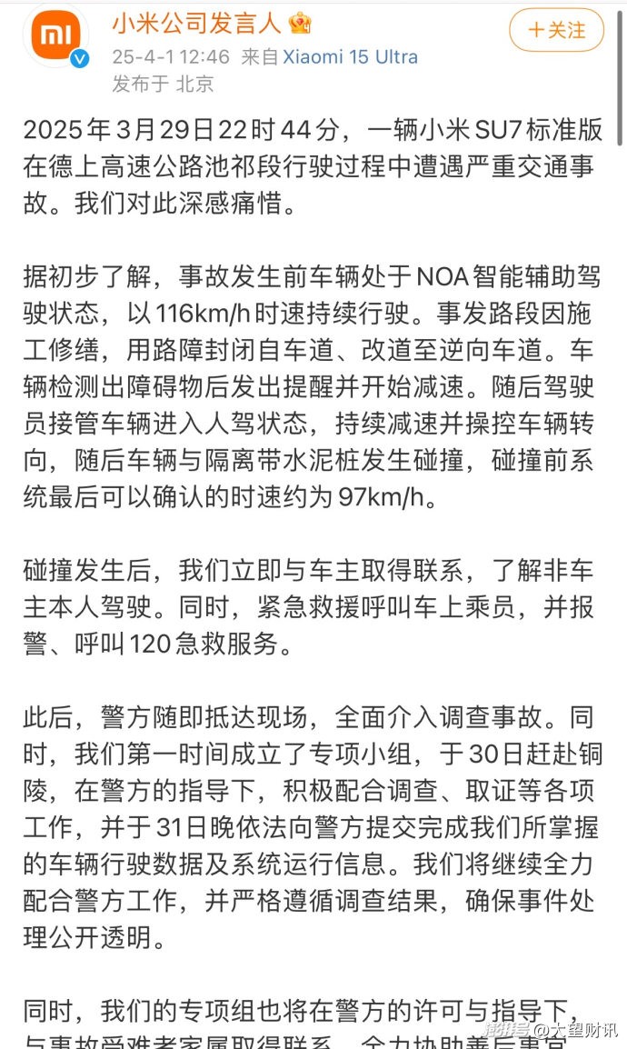 权威证实:依赖调查,亟需背书 当下,事故仍深陷调查的迷雾之中,小米虽积极配合警方,但截至目前,尚无权威第三方机构对事故原因作出定论。在此情形下,公众对小米单方面给出的回应,难免心存疑虑。诚如危机公关的原则所强调,企业自证往往困难重重,犹如逆水行舟,亟需借助权威外力的支持。小米迫切需要依托警方的调查结果、专业汽车检测机构的科学评估等权威信息,为自身的说法提供坚实有力的支撑,以此提升公众对其回应的信任度,方能在舆论的汹涌浪潮中站稳脚跟,有效化解这场严峻的危机。