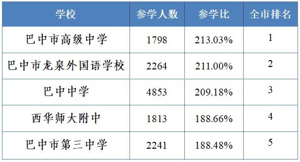 根据学习平台后台显示,上一期5个市直属学校参学比均达到100%及以上。其中,巴中市高级中学以213.03%参学比位居全市第一。望各位市直属学校继续保持,在接下来的学习中再接再厉。