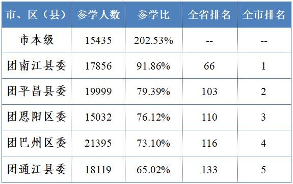 根据学习平台后台显示,上一期全市参学比为83.51%。团南江县委以参学比91.86%位居全市第一。排名靠后的区县在接下来的学习中需进一步努力。