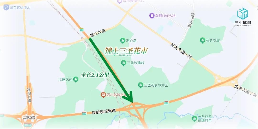 在官方的介绍当中,该项目也叫「三圣花乡花卉市场整体搬迁项目」,全长2.1公里,总面积约为12万㎡,集鲜切花、绿植盆栽、户外园艺、鱼鸟萌宠、资材花器、文创手工、餐饮游乐等于一体。
