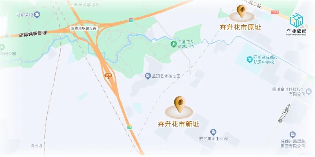 今年,卉升文创公园花市再次搬迁,目前大部分商家已搬至成都市龙泉驿经开区南4路1888号中泰科技工业综合体内。