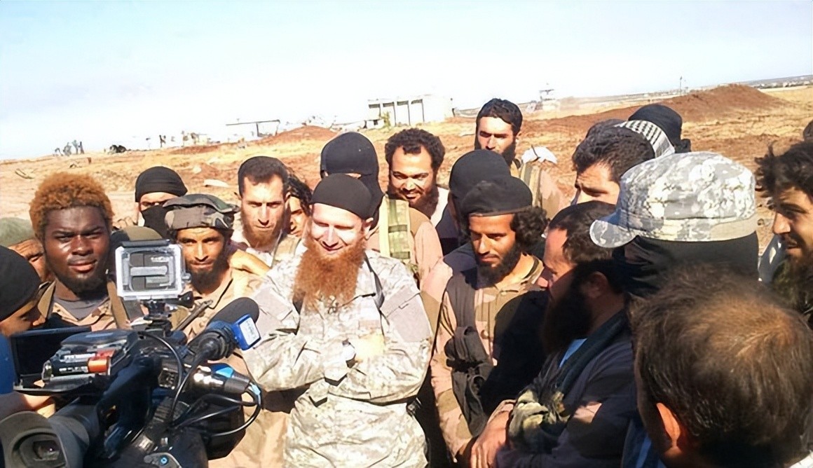 值得一提的是指挥总攻的ISIL指挥官阿布·奥马尔·舒斯哈尼,他的真名是Tarkhan Batirashvili,他是格鲁吉亚人,参加过2008年的俄格战争。后因肺结核退伍,退伍后先在警察部门干过因为私下买卖枪支和从事极端宗教活动被开除,之后投入监狱关了三年,但一年多就出狱了。后和车臣以及达吉斯坦的恐怖分子勾结,之后来到叙利亚并逐渐成为在叙高加索恐怖武装的头目。他最开始在胜利阵线,后来带领部分亲信加入了伊斯兰国武装。下图中留着红色长胡子的就是阿布·奥马尔,簇拥在他身边的武装分子里几乎没有叙利亚人。而讽刺的是,这场战争被称为“叙利亚内战”。