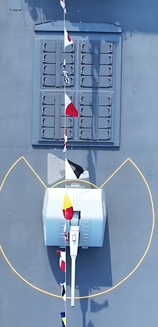 其次,054B导弹护卫舰的主炮换装了一门全新的口径为100毫米的隐身全自动速射舰炮,该炮相对于前两型054系列导弹护卫舰上使用的主炮H/PJ-26式76毫米隐身舰炮来说,单发弹丸毁伤能力更大,射程更远,并通过可能的双链路供弹设计,提高了该炮切换不同弹种时的速度,提高了其作战使用灵活性和反应速度。并且,考虑到国内制导炮弹技术在近年来的高速发展,054B导弹护卫舰上的这门新型100毫米隐身全自动速射舰炮,也可能配备了新的制导炮弹,从而,进一步增强了其自身的作战能力。