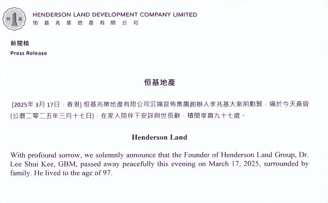 恒基地产在李兆基逝世之后,对外证实了他离世的消息。