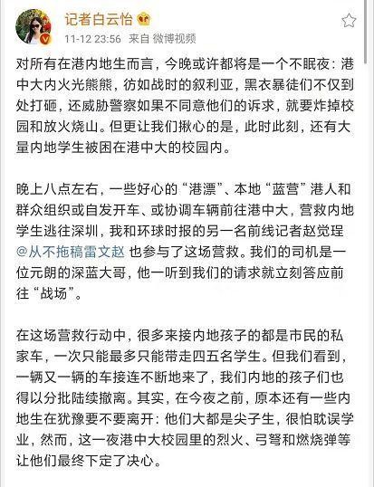 12日晚,环球时报赴香港特派记者白云怡在微博上讲述了香港中文大学校园内暴力肆虐,内地生恐慌希望逃离的情况。她还介绍说,港中大的好心人士和香港市民12日晚开始了一场协助内地生逃往深圳的紧张救援,她与同事也参与其中,亲历整个过程。刚刚,环球时报总编在微博上为环球时报记者参与救援点赞,表示代表读者向他们致敬。