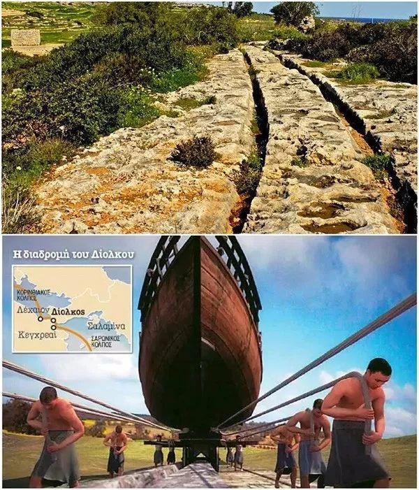 古代航海技术和设备有限,经常遭遇暴风雨,海难频发,而且这里海盗也十分猖獗。为此古希腊人在地峡上开凿了一条被称为“Diolkos(迪尔克斯)”的石轨,将船从地峡的一边拉到另一边。最著名的就是在公元前428年著名的伯罗奔尼撒战争中,斯巴达人通过石轨把战船运到萨罗尼克湾,直接威胁雅典,最终赢得战争的胜利。这条石轨甚至被史学家称为“轨道交通之父”。