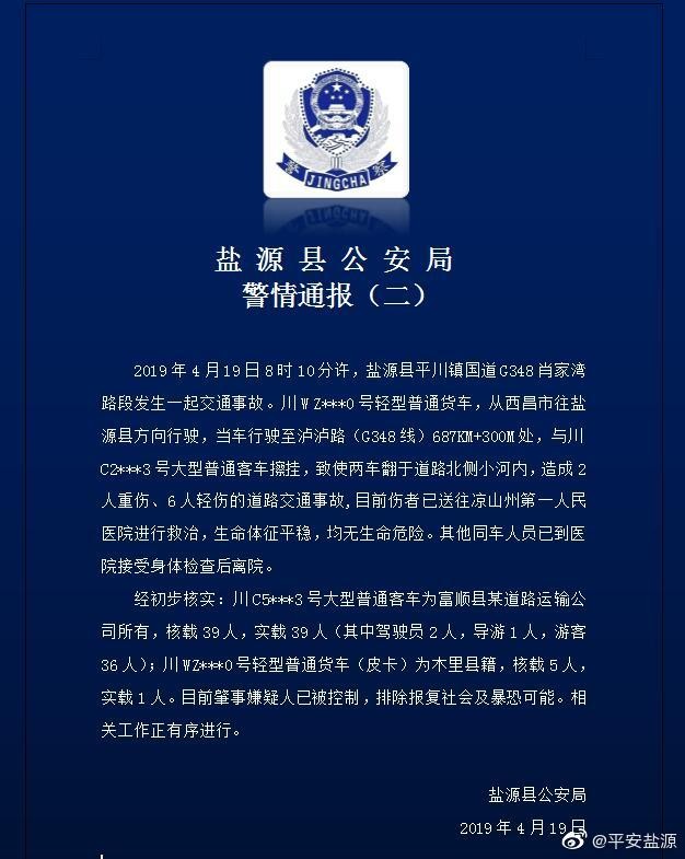 据四川省凉山州盐源县公安局通报, 4月19日8时10分许,盐源县平川镇肖家湾发生一起交通事故。一辆皮卡车与一辆大型普通客车发生擦挂,致使两车翻于道路北侧小河沟内,造成2人重伤、6人轻伤。目前,伤者已送州第一人民医院救治,无生命危险。目前肇事嫌疑人已被控制,排除报复社会及暴恐可能。相关工作正有序进行。据当地媒体报道,坠河大客车为前往泸沽湖的旅游大巴。