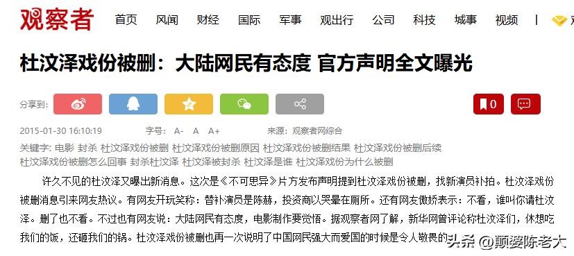 信息来源:观察者网——杜汶泽戏份被删:大陆网民有态度 官方声明全文曝光