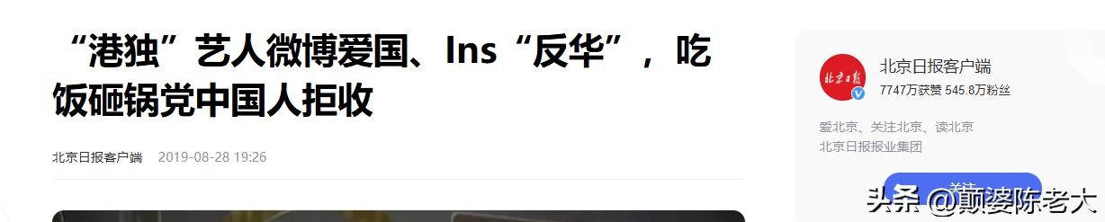 信息来源:北京日报客户端——“港独”艺人微博爱国、Ins“反华”,吃饭砸锅党中国人拒收