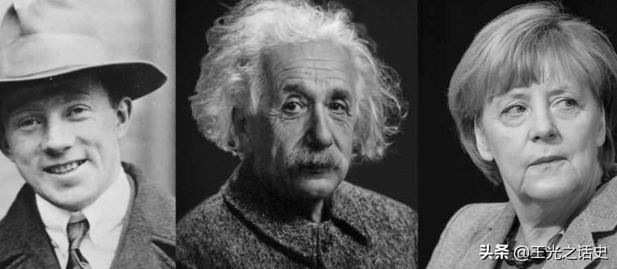 从左至右分别是海森堡、爱因斯坦和默克尔,他们都是在德国出身的物理学家