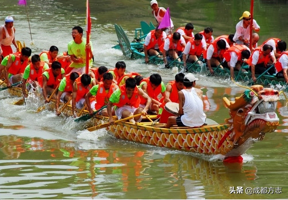 赛龙舟,是把船装扮成龙的模样,多人集体在水上划桨竞赛。作为一项体育活动,早在战国时代就有了,因为在急鼓声中划刻成龙形的独木舟,做竞渡游戏,以娱神与乐人,是祭仪中半宗教性、半娱乐性的节目,慢慢地,时间给赛龙舟付予了不同的寓意。至于这一活动与纪念屈原联系,或许是人们崇敬屈原之情的因势赋予。如今龙舟比赛逐渐被大众所接受,1980年赛龙舟被列入中国国家体育比赛项目。
