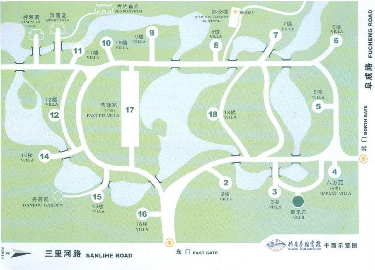在小城堡不远处,有一个小巧典雅的庭院,建筑精美,古树参天,被称为"养源斋"。养源斋稍往北,有一个开放的大厅,殿前的池子里,水很清澈,这就是"钓鱼台"之所,是古代帝王钓鱼的地方。这也是钓鱼台国宾馆的名字的由来。