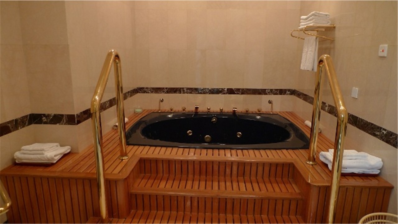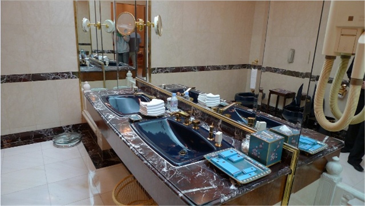 与卧室相连的浴室采用浅黄色芙蓉大理石,铺白色大理石。内墙为景德镇制作的具有南海风光的瓷砖壁画。房间配备了现代化的卫生设备。宽大的浴缸四角有四根镀黄的柱子。浴缸内壁周围有许多水孔。洗澡时,水的冲击波能起到按摩的作用,缓解外国元首客人的疲劳。