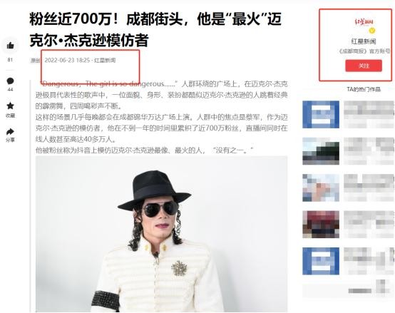 [3] 红星新闻 2022年6月23日 粉丝近700万!成都街头,他是“最火”迈克尔·杰克逊模仿者