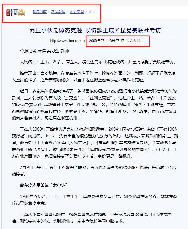 [1] 新浪河南-东方今报 2009年7月13日 商丘小伙最像杰克逊 模仿歌王成名接受美联社专访