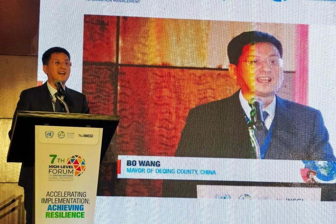 德清县委书记王波在第七届联合国全球地理信息管理高层论坛上发言。(德清县委宣传部供图)