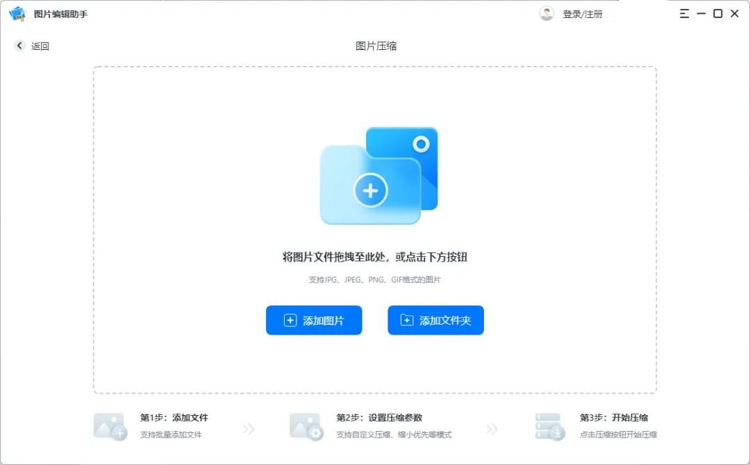 在图片编辑下找到“图片压缩”功能,随后在新的页面上传文件/文件夹,支持JPG、JPEG、PNG、GIF格式的图片上传。