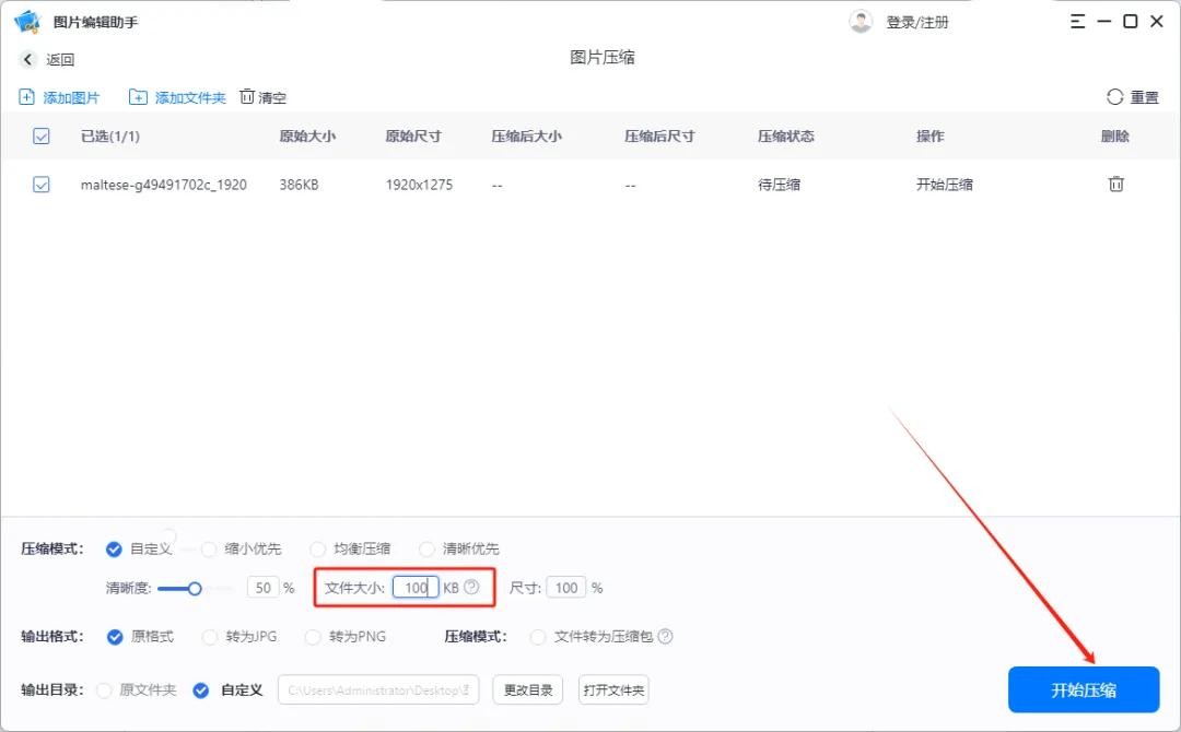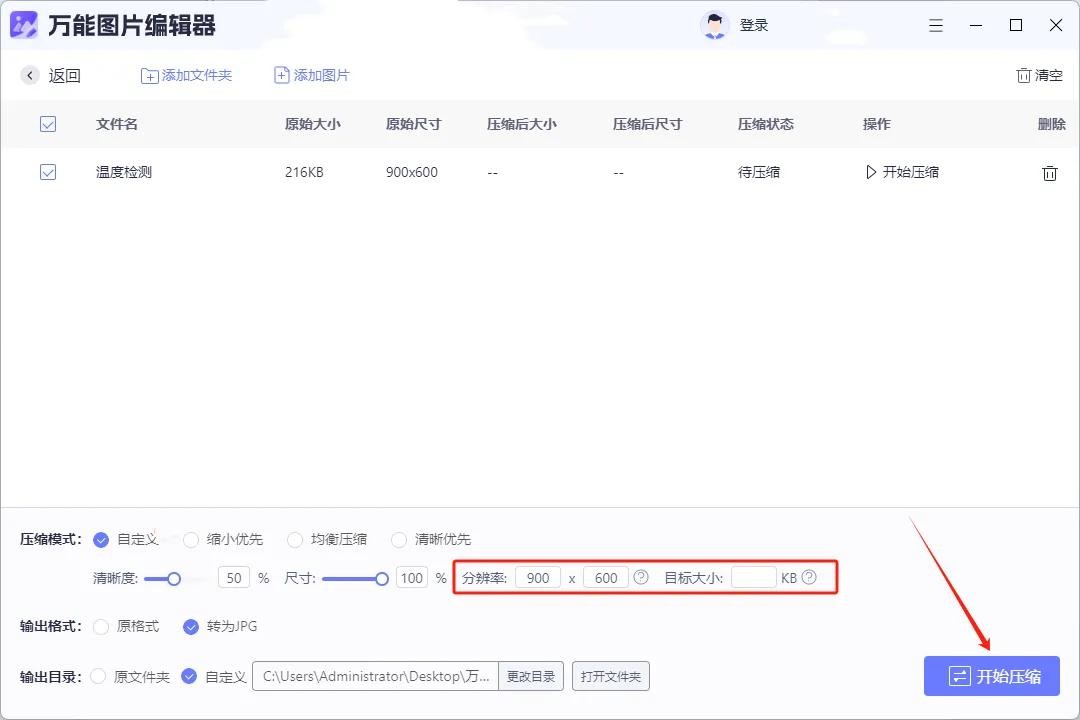 在首页找到“批量图片压缩”功能,支持上传单张或多张图片文件,图片上传后在操作页面即可自定义分辨率和图片的目标大小,完成设置后点击“开始压缩”按钮即可成功将图片缩小至指定大小。
