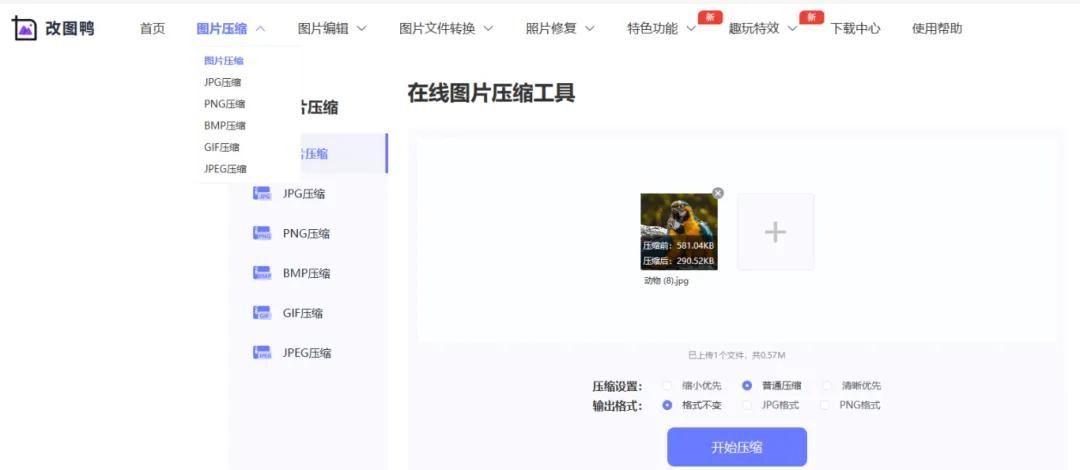 它是一个在线图片处理工具,提供图片编辑、图片编辑、图片文件转换以及照片修复等大量实用功能。它的图片压缩功能提供JPG、PNG、BMP等不同图片格式的压缩功能,选定功能后上传图片文件即可在操作页面完成图片压缩操作,并且还可以实时预览压缩前后的大小对比。