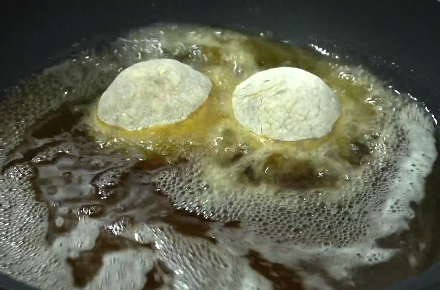 4,起锅烧油,油温烧到下入筷子冒密集的小泡泡,把肉丸子沿着锅边放进来,全程小火慢炸,刚下锅的时候不要翻动,等定型之后用筷子转圈翻动,使丸子受热均匀,一直炸到丸子表面金黄就可以出锅了。