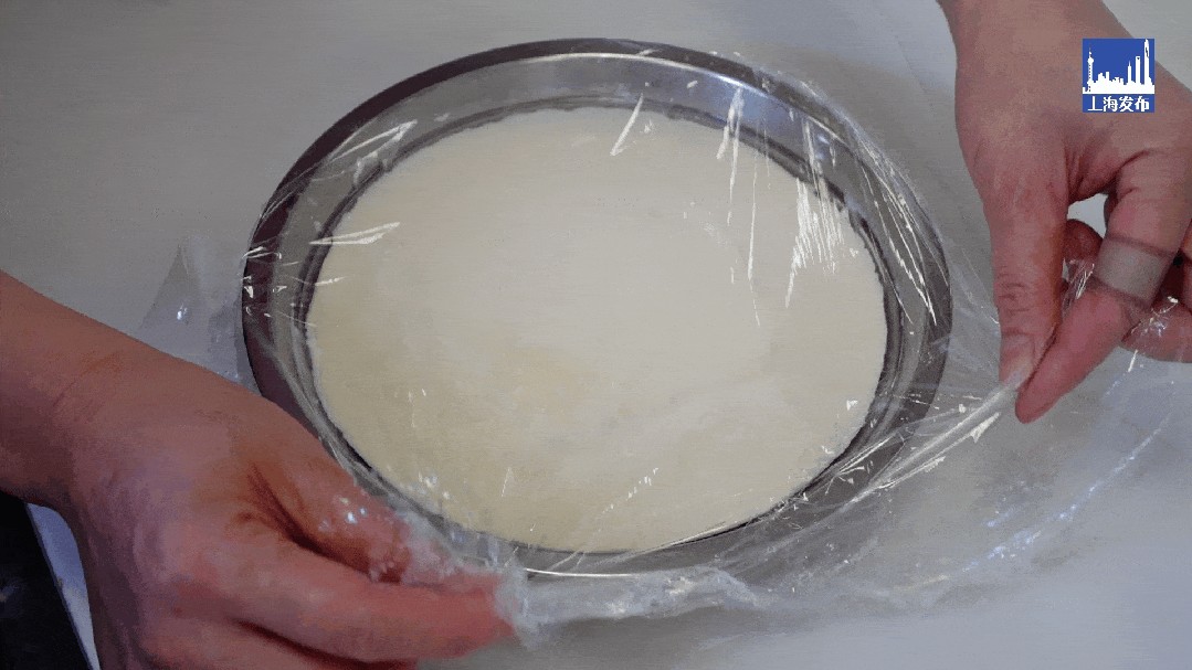 3.化开的内脂粉倒入豆浆,撇去浮沫,包保鲜膜,静置15分钟。