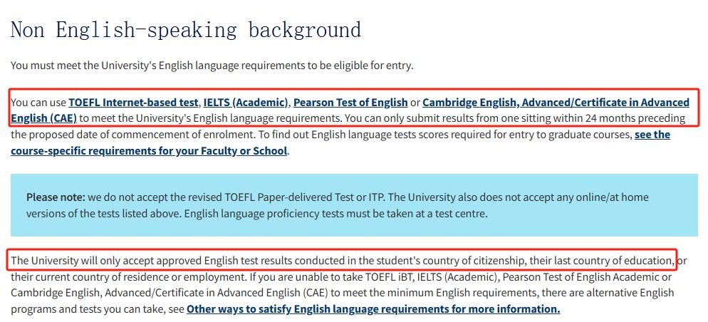 红框部分的内容:墨尔本大学将不接受任何在申请人国籍国、最后一个受教育国、当前居住国或工作国以外的国家参加的英语语言测试。