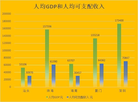 以人均GDP和人均可支配收入这两组数据为参考,我们会发现5个经济特区的发展水平处于两组完全不同的发展阶段: