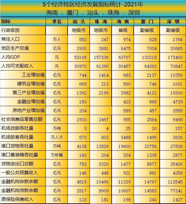 5大经济特区—深圳珠海厦门海南汕头的主要经济发展指标