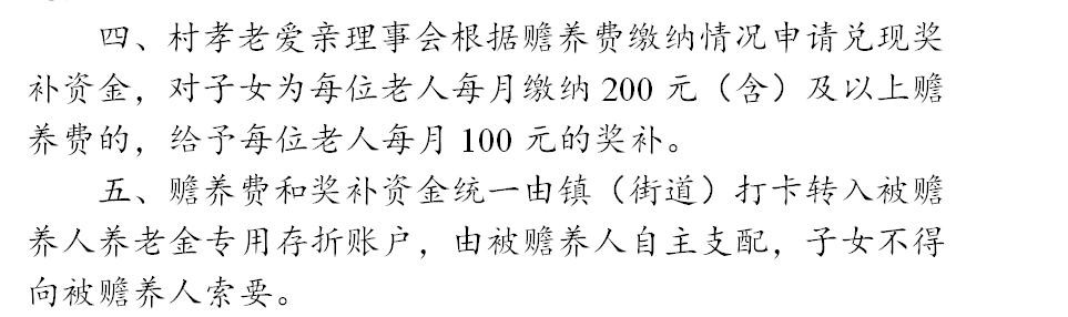 3、养老方面:由子女为每位70周岁以上每月老人缴纳200元赡养费,政府每月补助100元。