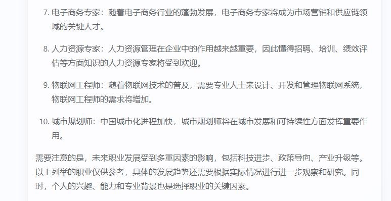 需要注意的是,未来职业发展受到多重因素的影响,包括科技进步、政策导向、产业升级等。以上列举的职业仅供参考,具体的发展趋势还需要根据实际情况进行进一步观察和研究。同时,个人的兴趣、能力和专业背景也是选择职业的关键因素。