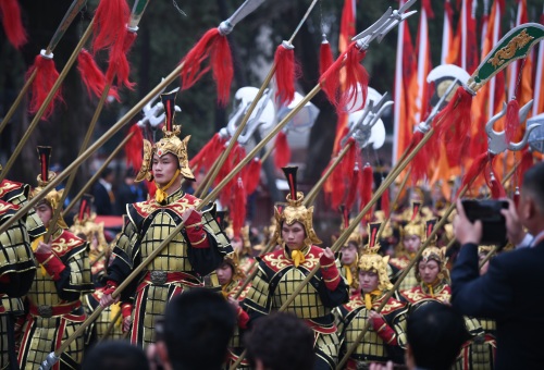 4月4日,参加公祭轩辕黄帝典礼的演员步入黄陵县桥山祭祀广场。 新华社记者 张博文 摄