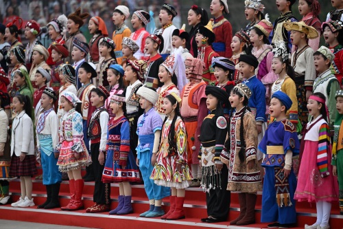4月4日,身穿民族服饰的儿童在公祭轩辕黄帝典礼上合唱《黄帝颂》。 新华社记者 陈晔华 摄