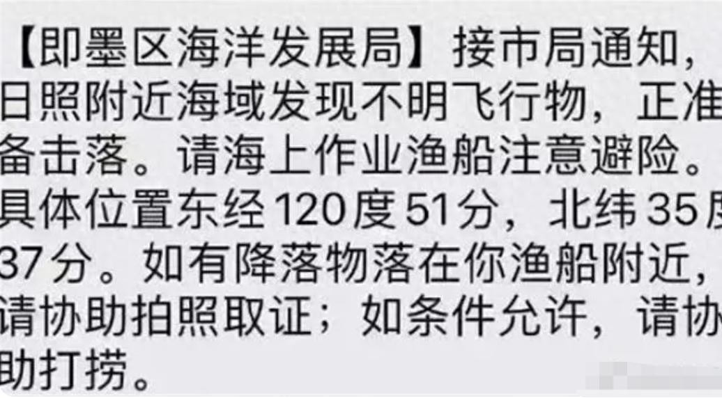 昨天,一则日照沿海出现不明飞行物的新闻突然在网上刷屏,说是根据青岛市即墨区海洋发展局的消息,在山东日照沿海地区,发现了一个不明飞行物,目前有关部门正准备击落这一飞行物,请在这一海区作业的渔民注意观察,注意安全,一旦发现有东西被击落掉在水中,可以协助进行打捞并拍照取证。