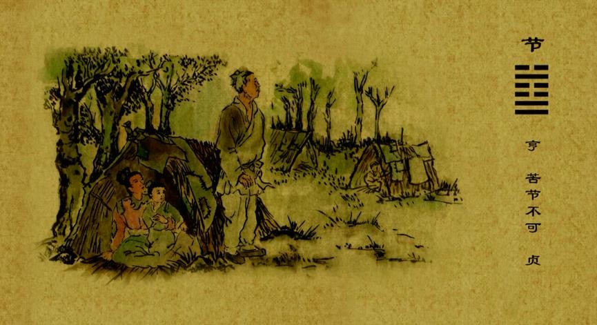 【节,亨,苦节不可,贞】节卦象征节制,对过度的行为进行节制可致亨通,节制适宜是件好事,但过分的节制,违背发展的需要是不可以的,应当持正适中,节而有度,切不可因节制而怨声载道,违背发展。