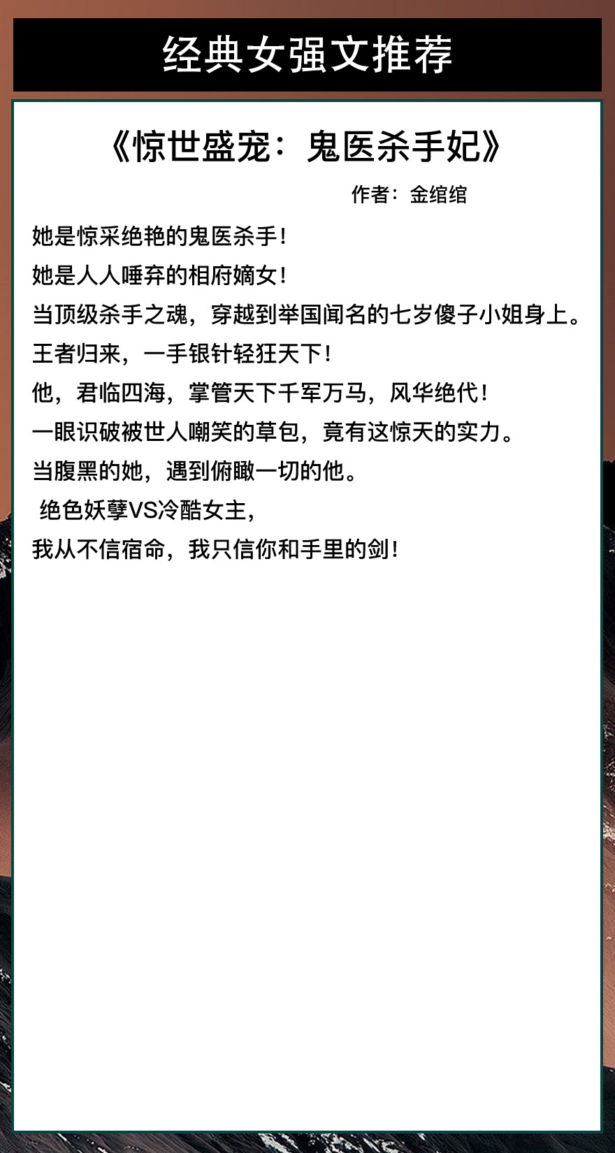 六本经典玄幻文推荐!女强文系列!《惊世盛宠:鬼医杀手妃》