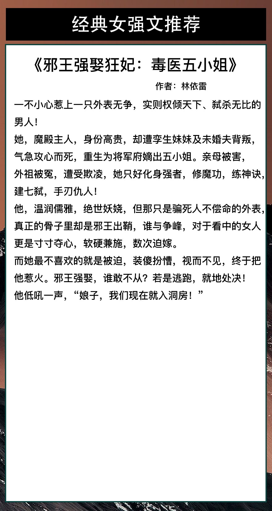 第六本《邪王强娶狂妃:毒医五小姐》作者:林依雷
