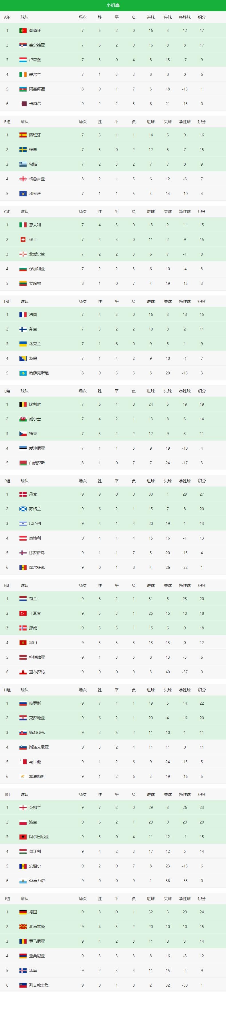 2022世界杯欧洲区预选赛实时积分表、赛程(11月14日)