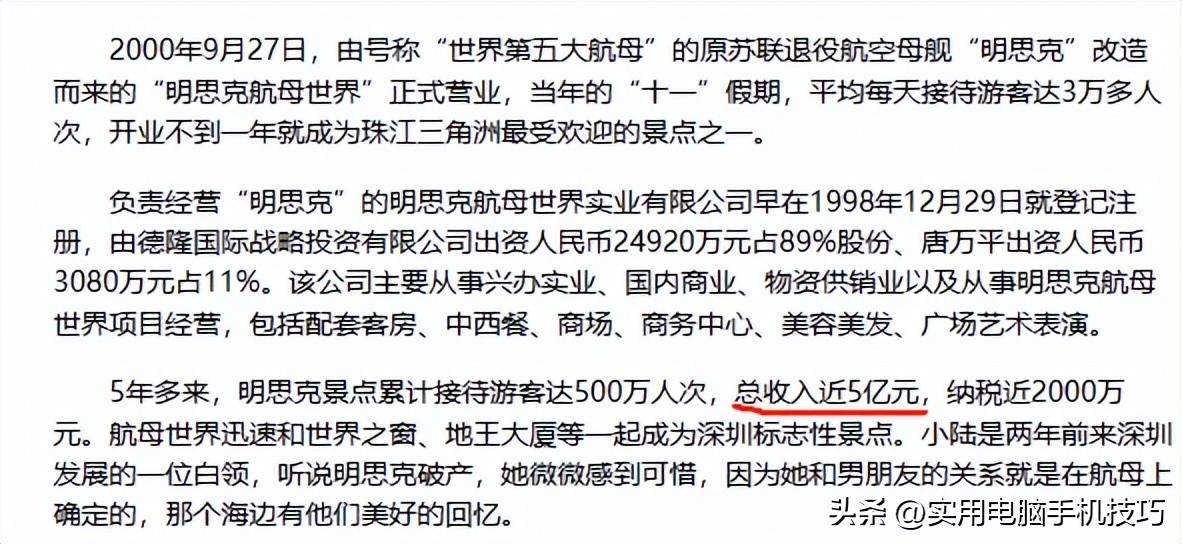 仅用5年时间,明思克航母世界累计接待游客500万人次,赚了近5亿元,光纳税都快2000万元。