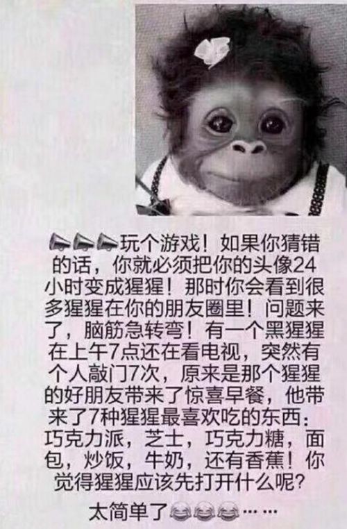 最近就有一道脑筋急转弯的题目,回答错误就要把自己的头像换成猩猩24小时,一个小时过去后,结果朋友圈满屏的猩猩。