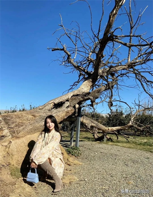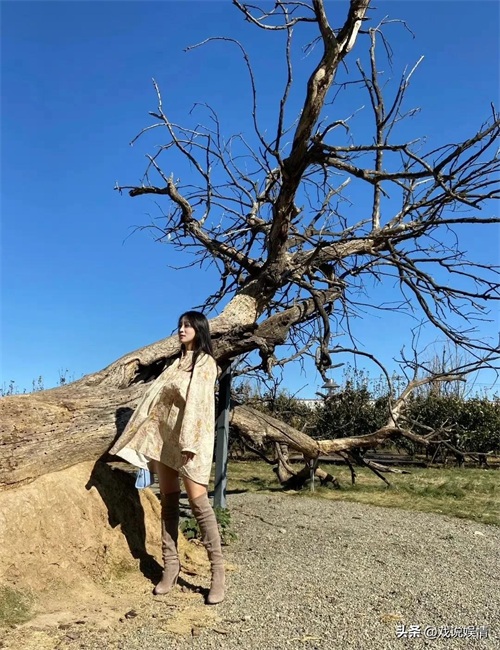 烧饼老婆身穿浅色印花蝙蝠衫搭配同色系长筒靴,站在一棵倒了的粗壮枯树旁拍照,背景是蔚蓝且万里无云的天空,画面氛围感满满,长筒靴的搭配尽显双腿修长纤细。